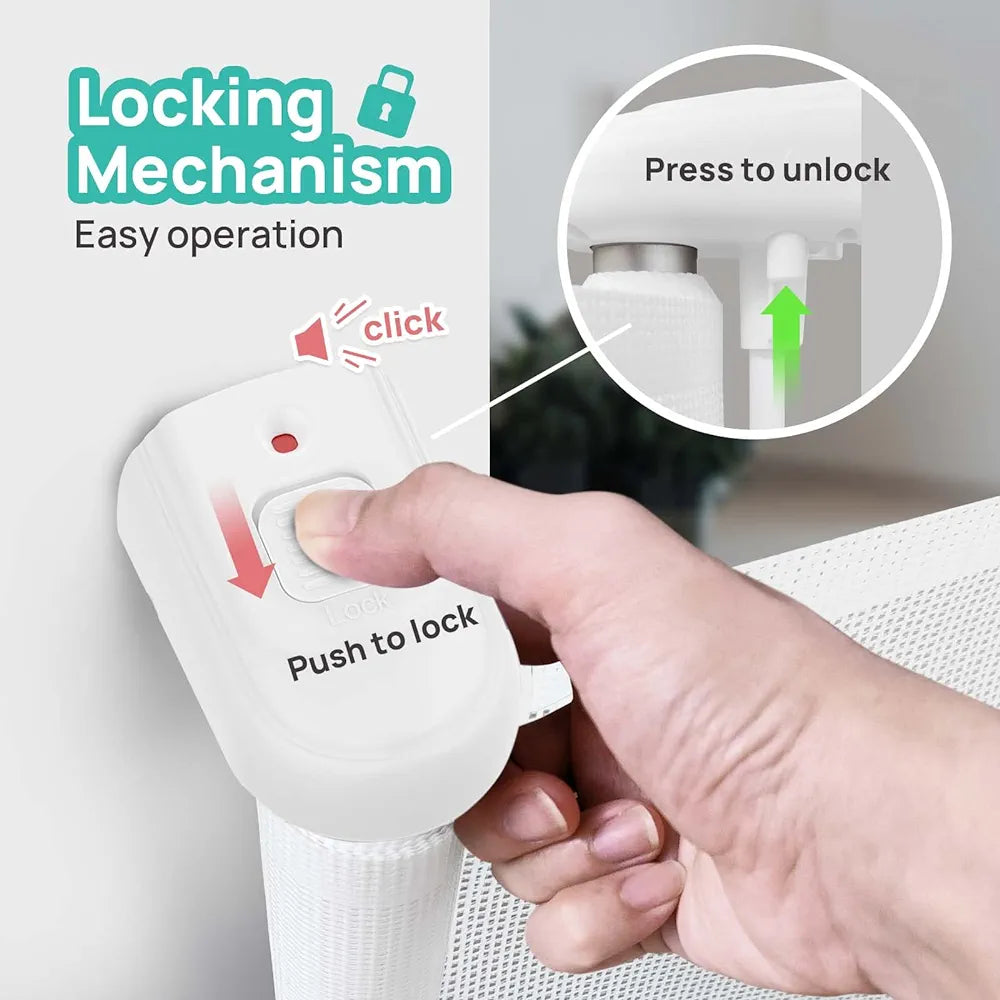 【Bloqueo unidireccional con ClickSound】 La puerta de seguridad para bebés admite el bloqueo/desbloqueo con una sola pulsación con el sonido de clic para recordarles a las mamás que la puerta está lista para funcionar. La pantalla de malla retráctil se fijará en una posición determinada cuando se active la función de bloqueo unidireccional, no se preocupe si su bebé o perro gatea debajo para escapar.