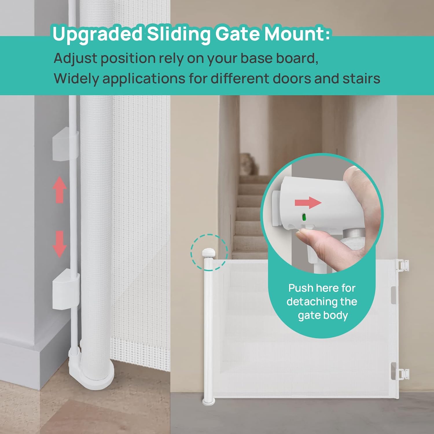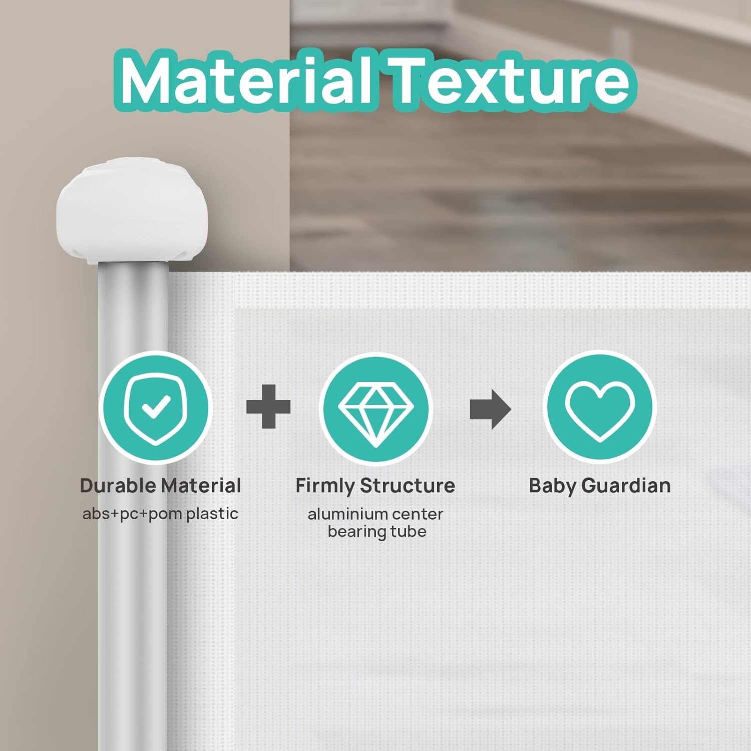Puerta de malla apta para bebés】 La puerta retráctil para bebés está hecha de ABS resistente y tela de malla resistente a los rayos UV con certificación CPC. A prueba de herrumbre, ya sea instalada en interiores o exteriores, la estructura de malla de panal no tóxica permite la circulación del aire, lo cual es amigable para niños, madres, perros y mascotas en el caluroso verano.