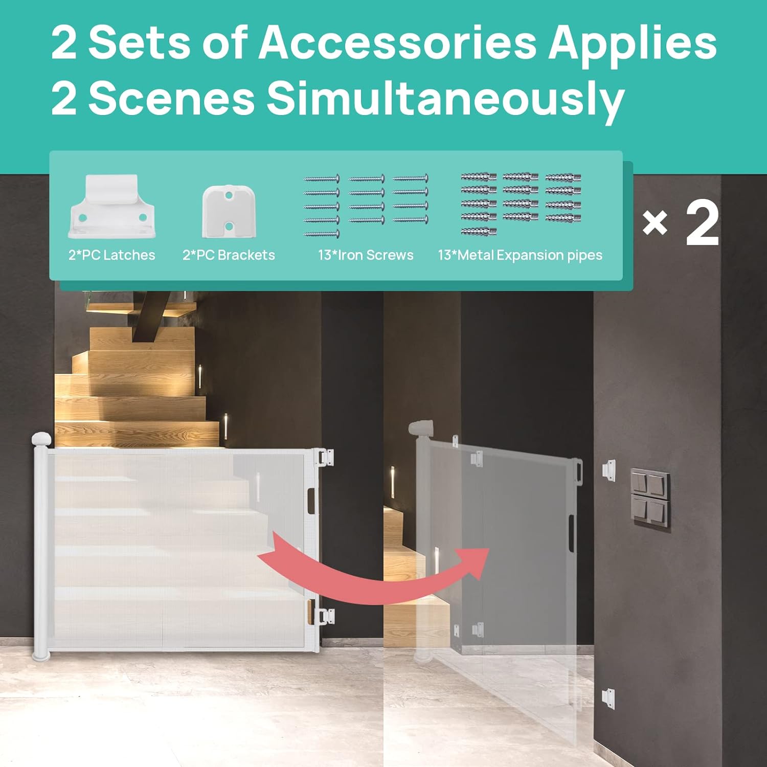 【Puerta para bebés extraíble para múltiples escenarios】 La puerta de malla proporciona 2 juegos de accesorios de instalación, fáciles de instalar y desmontar. El soporte de puerta inferior mejorado es ajustable en altura para adaptarse a diferentes zócalos, muy adecuado para escaleras, puertas, terrazas, pasillos, barandillas, salas de estar, etc.