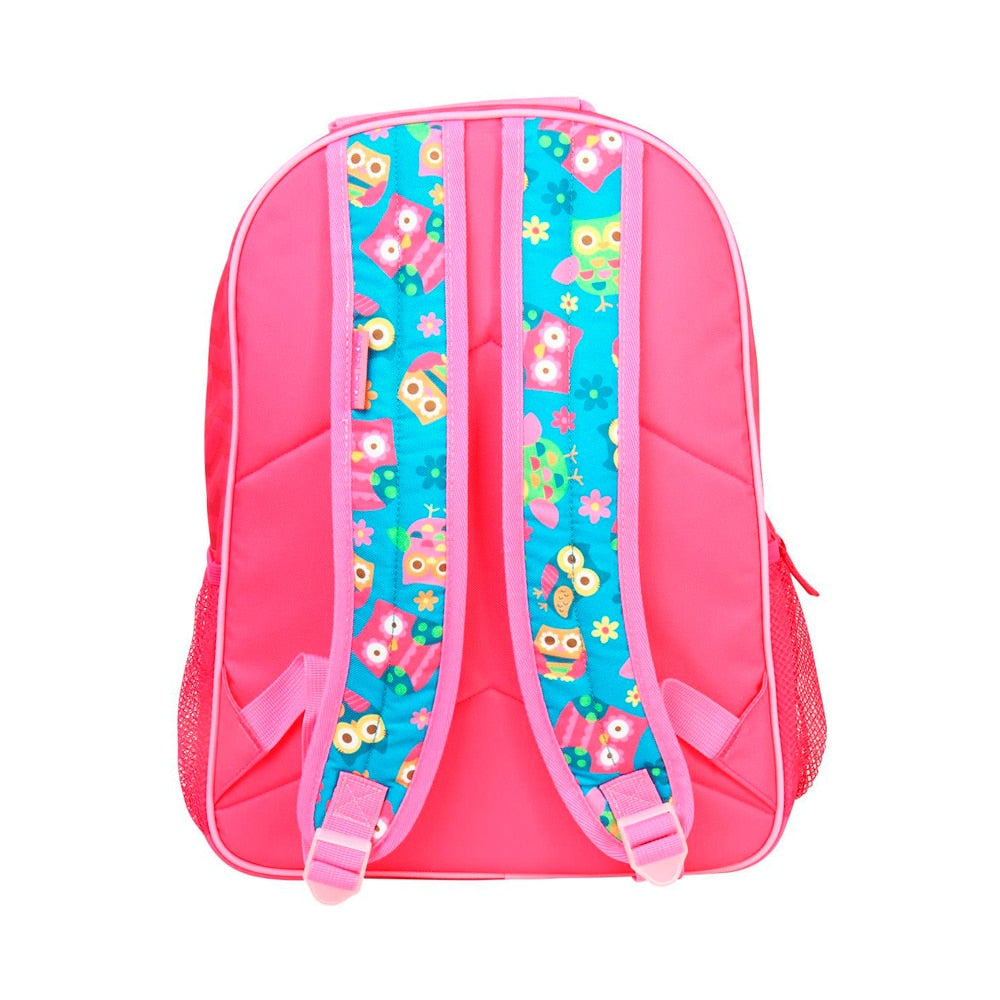 Bonita mochila de búho que es ideal para la escuela y viajes. Amplio compartimento principal que sostiene carpetas de tamaño completo con un bolsillo interior para papeles especiales o obras de arte. Las características de la mochila incluyen bolsillos laterales de malla para botellas de agua y correas acolchadas ajustables.