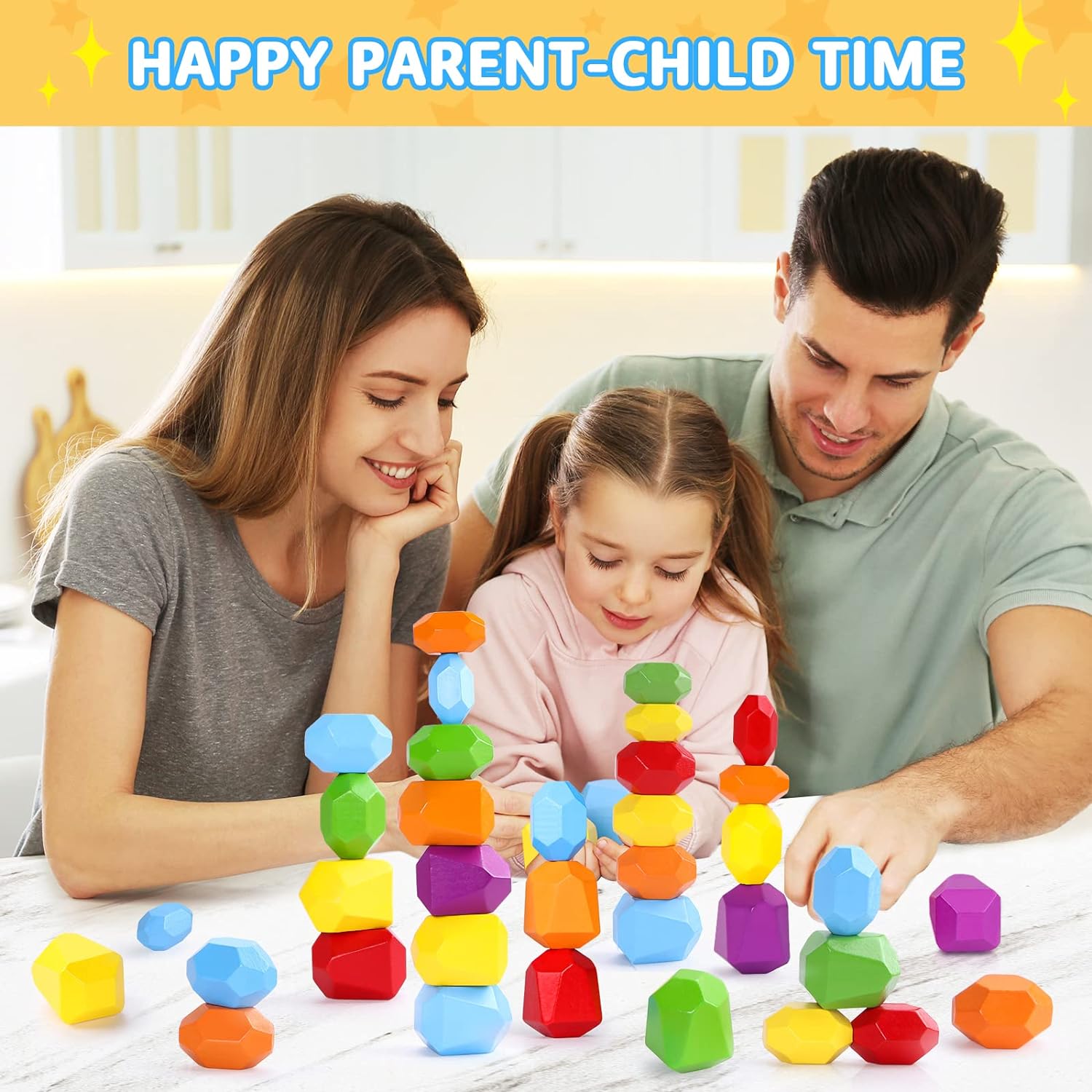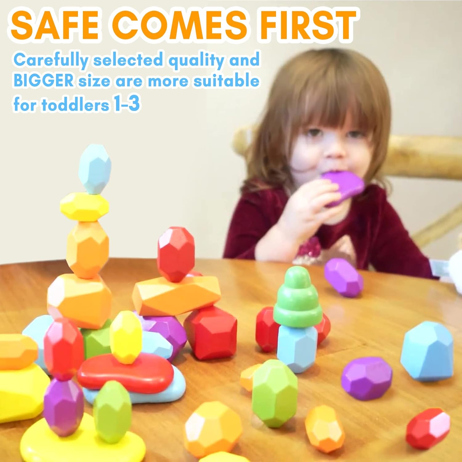 BLOQUES SEGUROS para NIÑOS 1-3: las piedras apilables están hechas de material de madera duradero y de alta calidad y pintura a base de agua no tóxica, es natural, ecológico y seguro para los niños. Los procesos de pulido manual con diseños de bordes lisos y redondeados protegen las manitas de los arañazos. El gran tamaño garantiza la seguridad del niño.