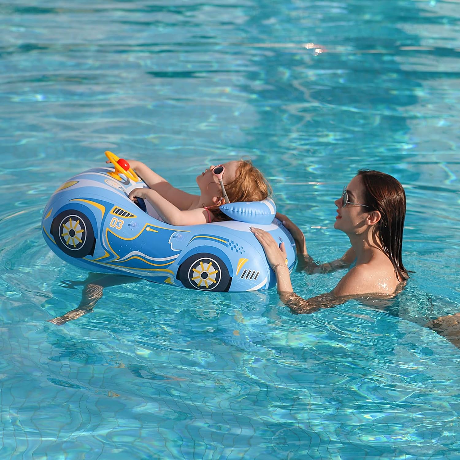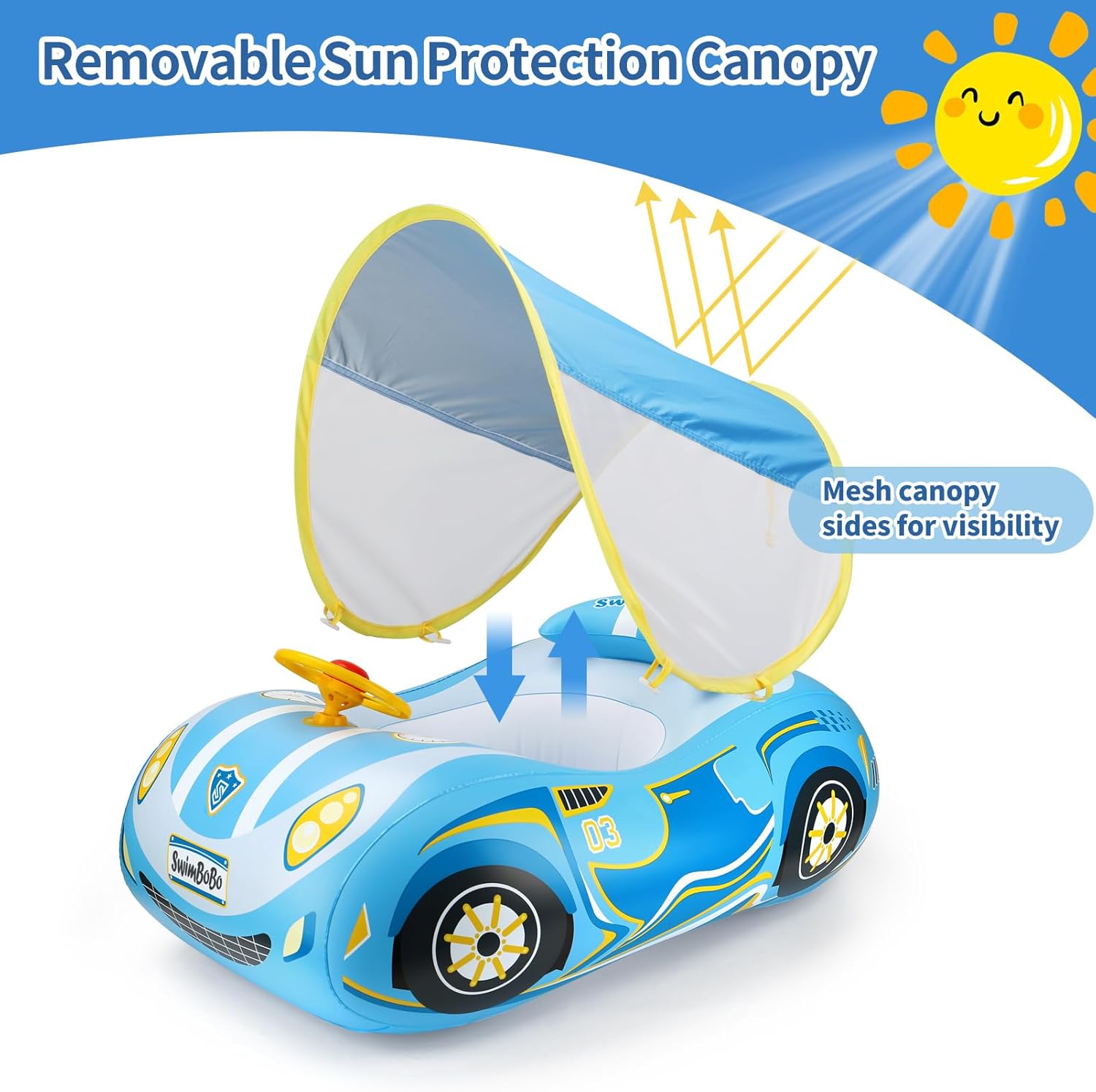 El flotador de piscina Cool Car Boat le presentará a su bebé las alegrías del agua, adecuado para niños mayores de 3 años, el toldo extraíble/ajustable cuenta con una bisagra de plástico de múltiples posiciones, que permite un rango de 120 grados y protección solar UPF 50.