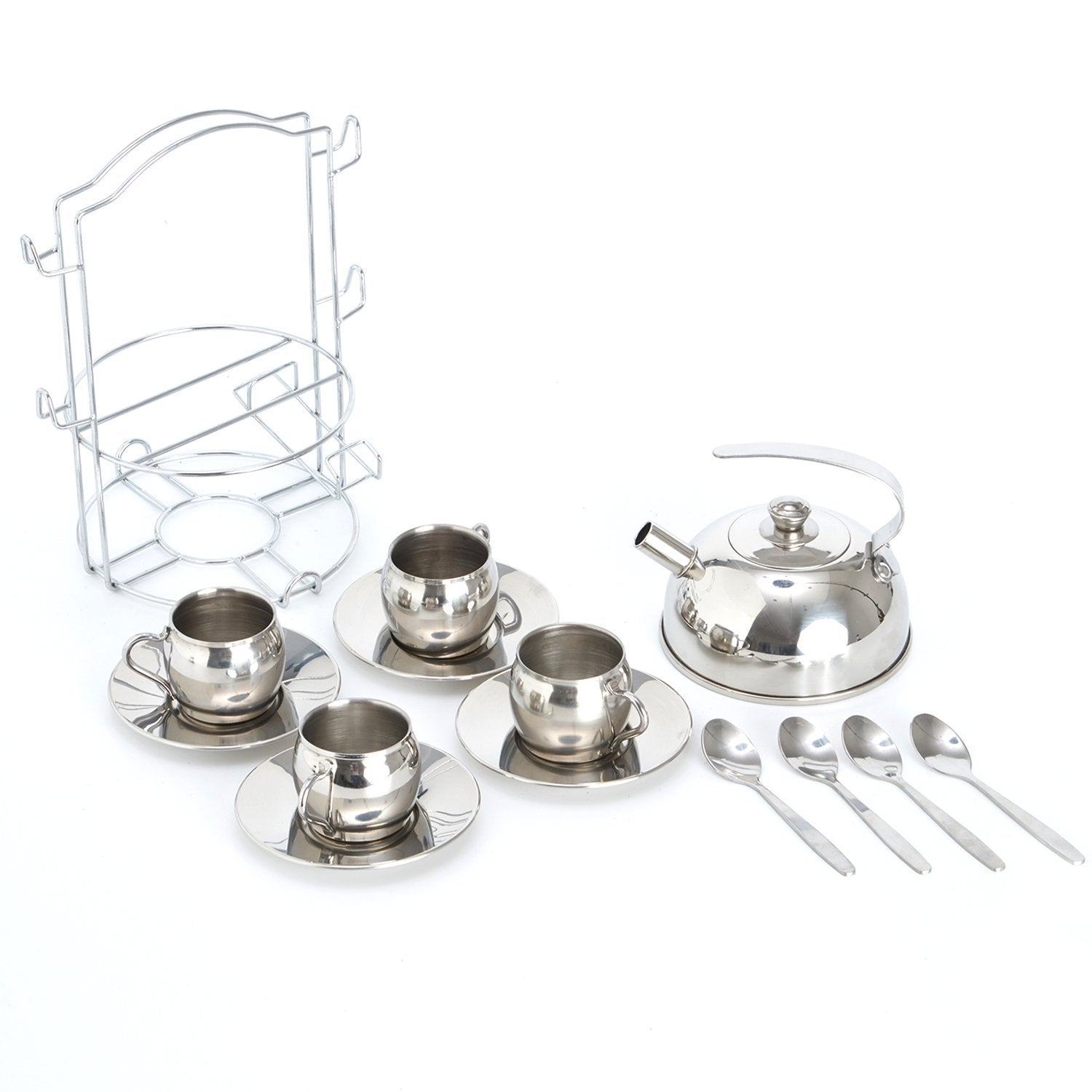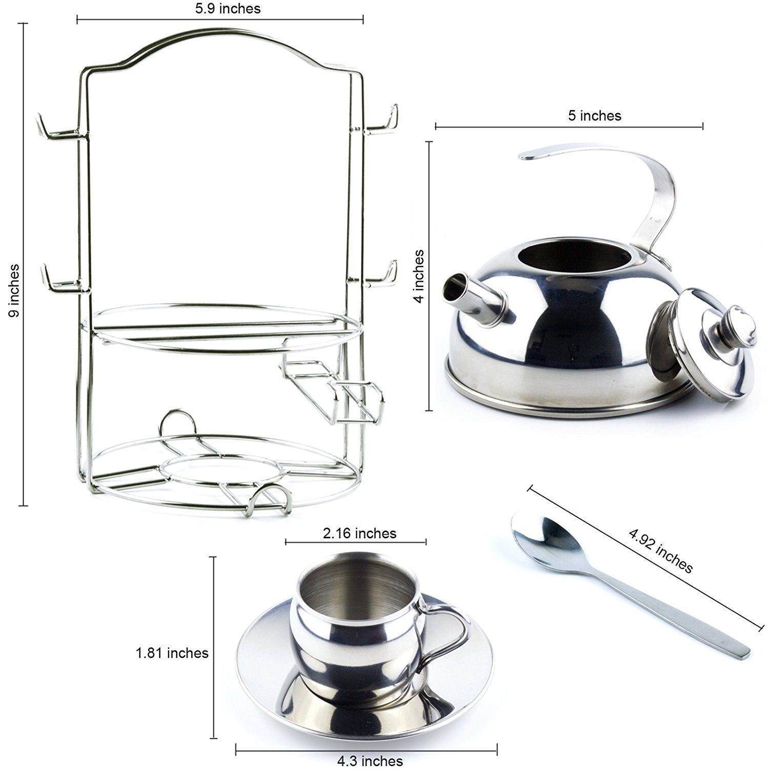- Dimensiones: 1 tetera: 4 x 5 pulgadas; 4 tazas de té: 1.8 x 2.2 pulgadas; 4 platillos: 0.5 x 4.25 pulgadas; 4 cucharas: 4.92 pulgadas; 1 organizador de transporte: 5.9 x 9 pulgadas.