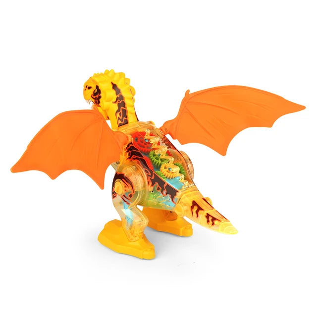 Los engranajes dentro del dinosaurio giran, y la carcasa transparente permite que la estructura del engranaje sea claramente visible. Las luces parpadean y cambian de color al ritmo de la música. Enciende la potencia y el dinosaurio mueve los pies hacia adelante.