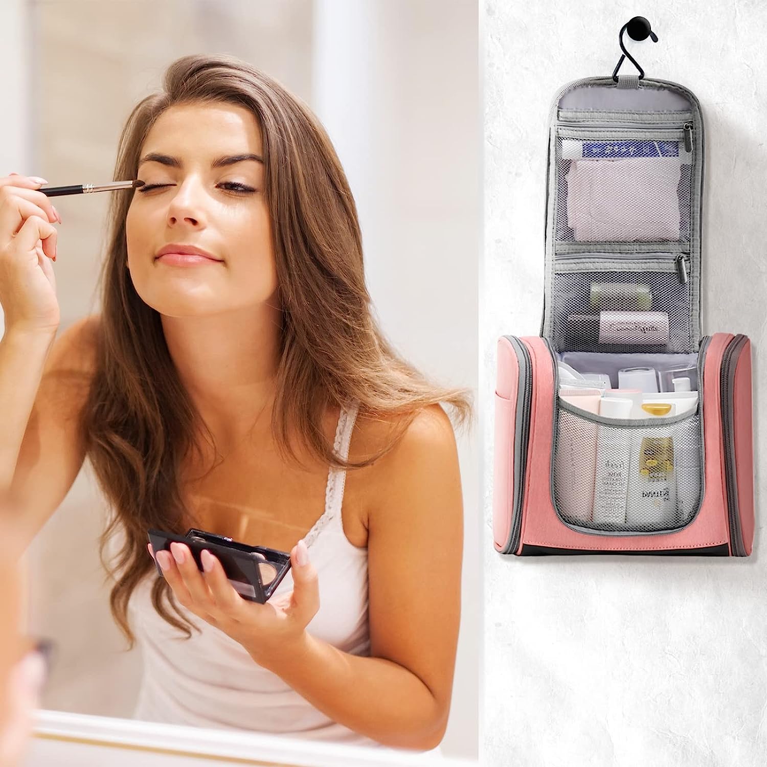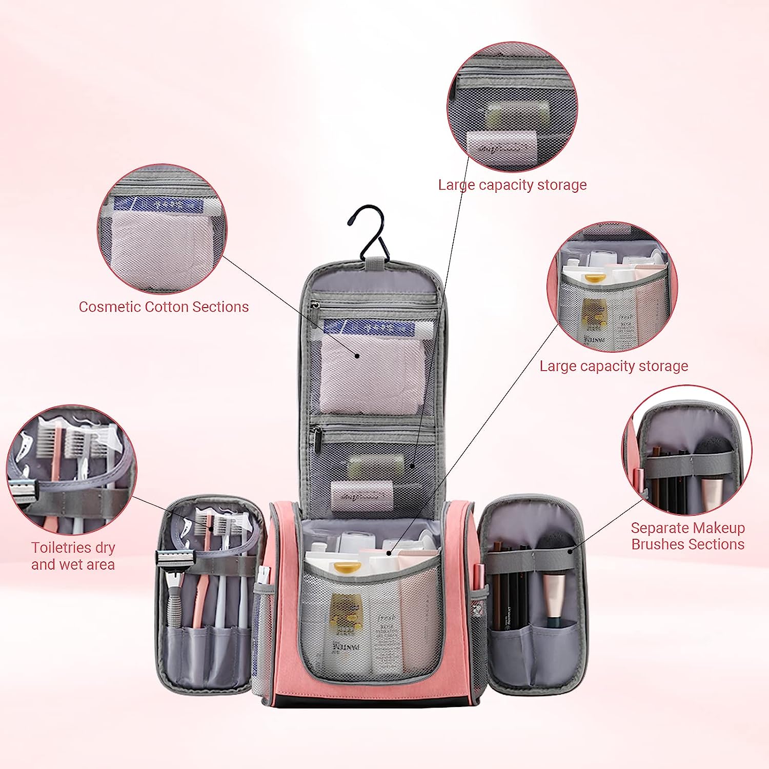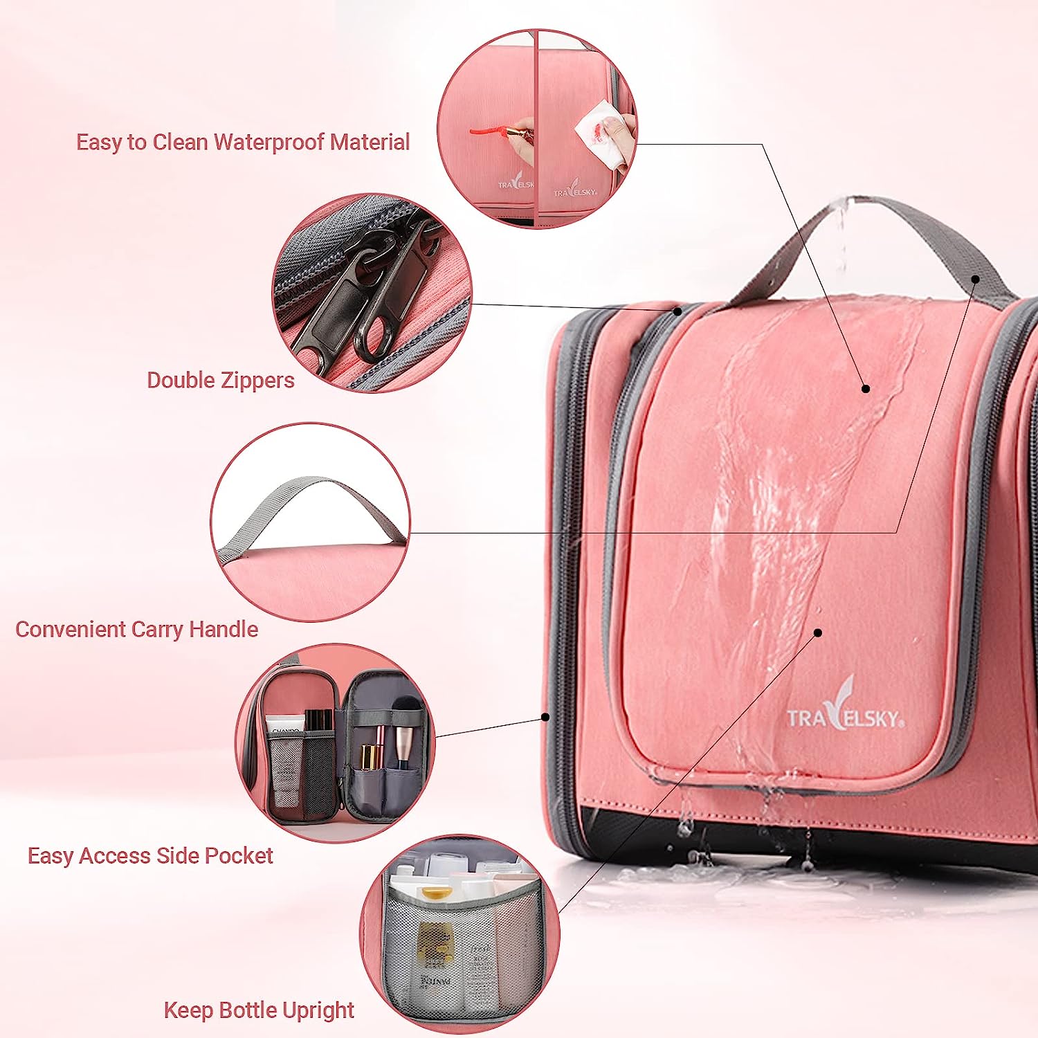 【Mucho espacio】Mide 9.8 x 8.5 x 4.7 pulgadas. El bolsillo más grande para artículos de cambiador de viaje y cosméticos como champú, acondicionador y loción. Bolsillos exteriores con cierre para un fácil almacenamiento de pasta dental, cepillo para polvo de dientes, cepillo para polvo de pelo, maquinilla de afeitar, cepillo para polvo de maquillaje y algunos artículos adicionales. Hay más espacio de almacenamiento, fácil de acomodar los artículos necesarios para viajar