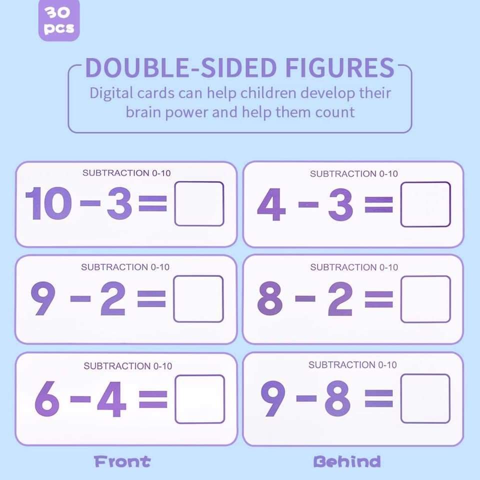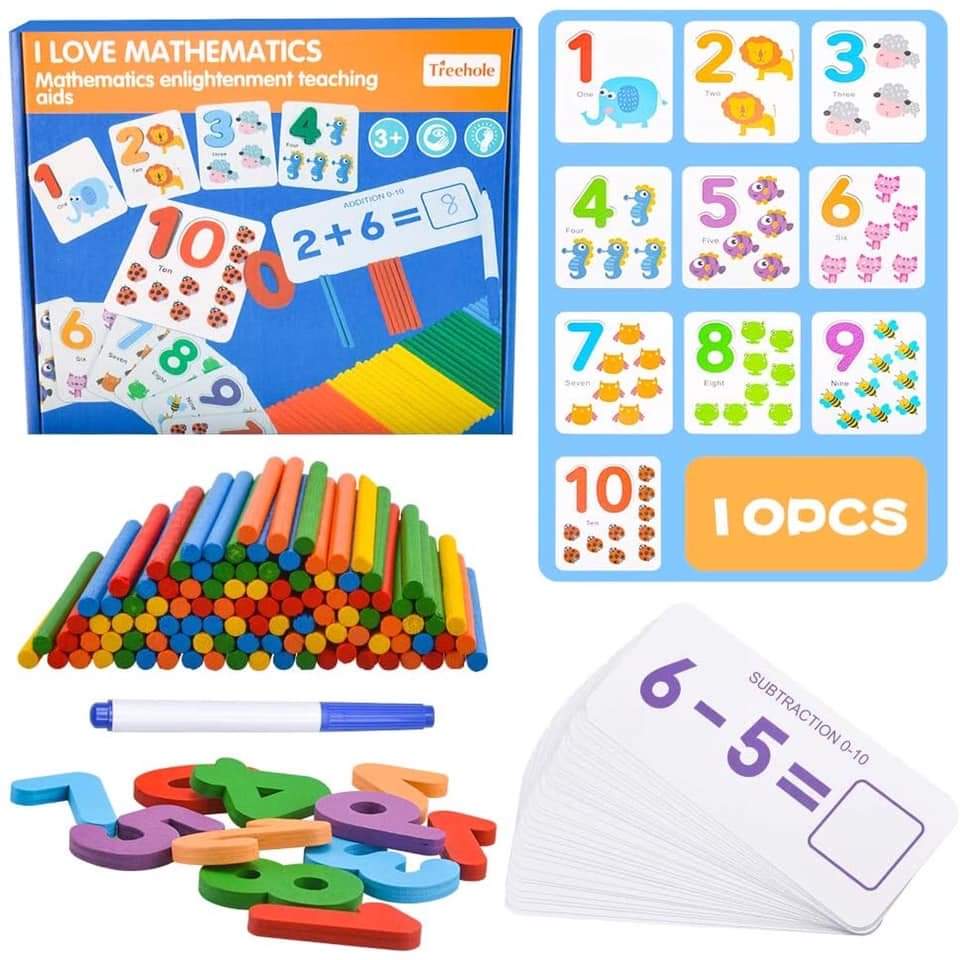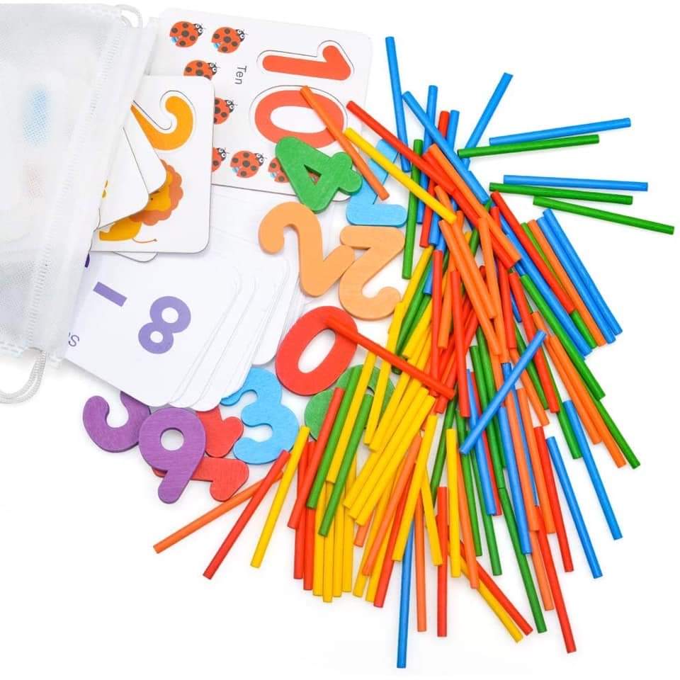 El paquete incluye: contiene 30 tarjetas largas (15 piezas adicionales y 15 piezas de sobras). Cada tarjeta tiene una pregunta de matemáticas en ambos lados), 10 tarjetas cuadradas, 100 palos de madera, 10 bloques numéricos de madera (0-9), 1 bolígrafo y 1 bolsa de almacenamiento.