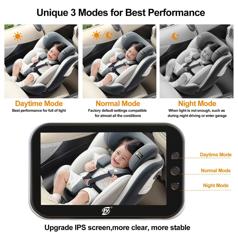 2. Tres modos: Diurno, Normal y Nocturno para su opción según el contraste y el ajuste de brillo. HD 1080P, súper claridad, todo hace que la conducción sea más segura para mamá en lugar de darse la vuelta o mirarse en el espejo del bebé.