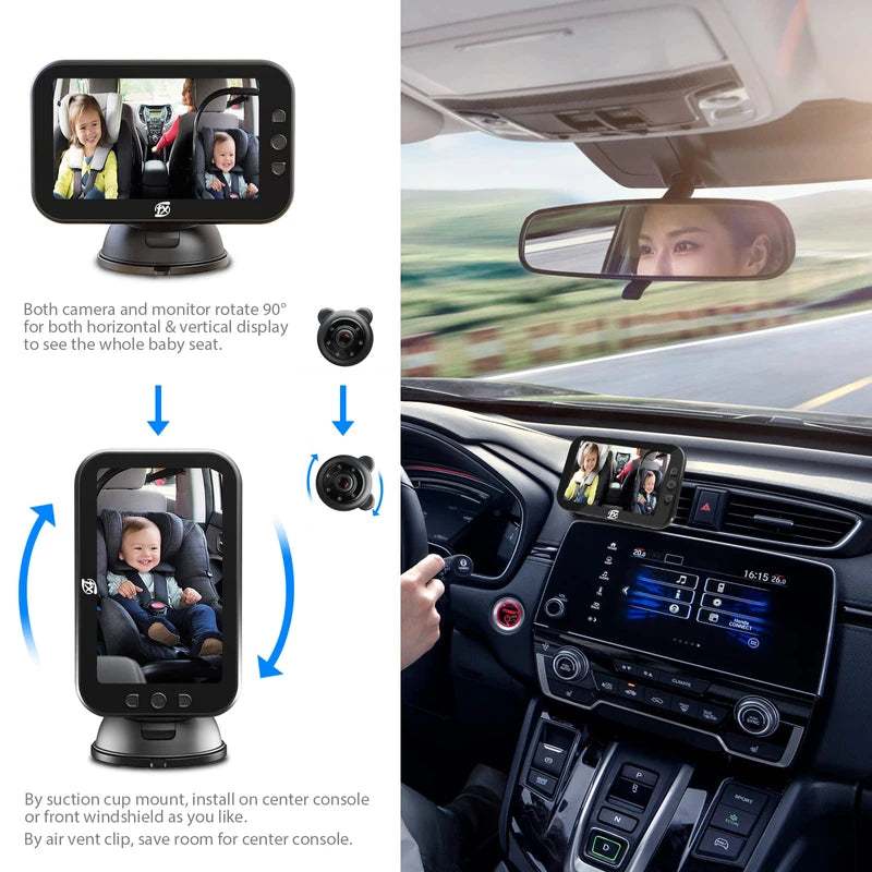 5. El soporte de ventosa reutilizable fija el monitor firmemente sin ninguna vibración, deslizándose hacia abajo o moviéndose, tanto la cámara como el monitor pueden girar 360° hasta cualquier ángulo de visión deseado. Especialmente, tanto la cámara como el monitor giran 90° para una visualización horizontal y vertical para ver todo el asiento del bebé.