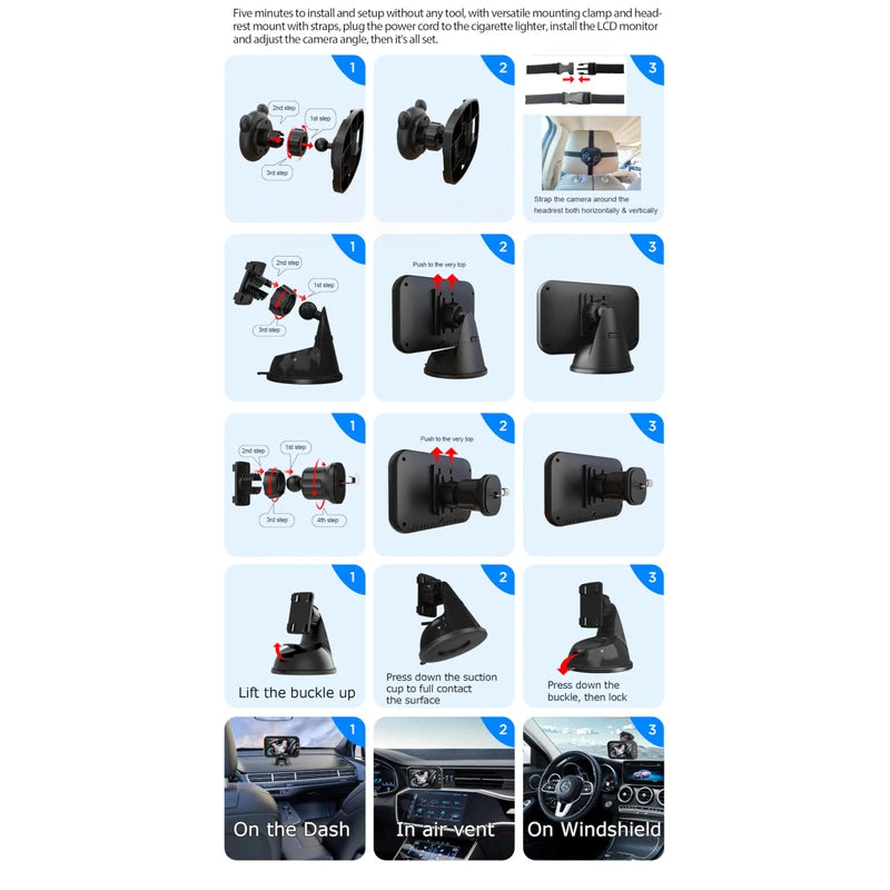 4. Cinco minutos para instalar y configurar sin ninguna herramienta, 2 formas de instalación del monitor: A: Mediante soporte de ventosa, instálelo en la consola central o en el parabrisas delantero como desee. B: Mediante el clip de ventilación, deje espacio para la consola central.