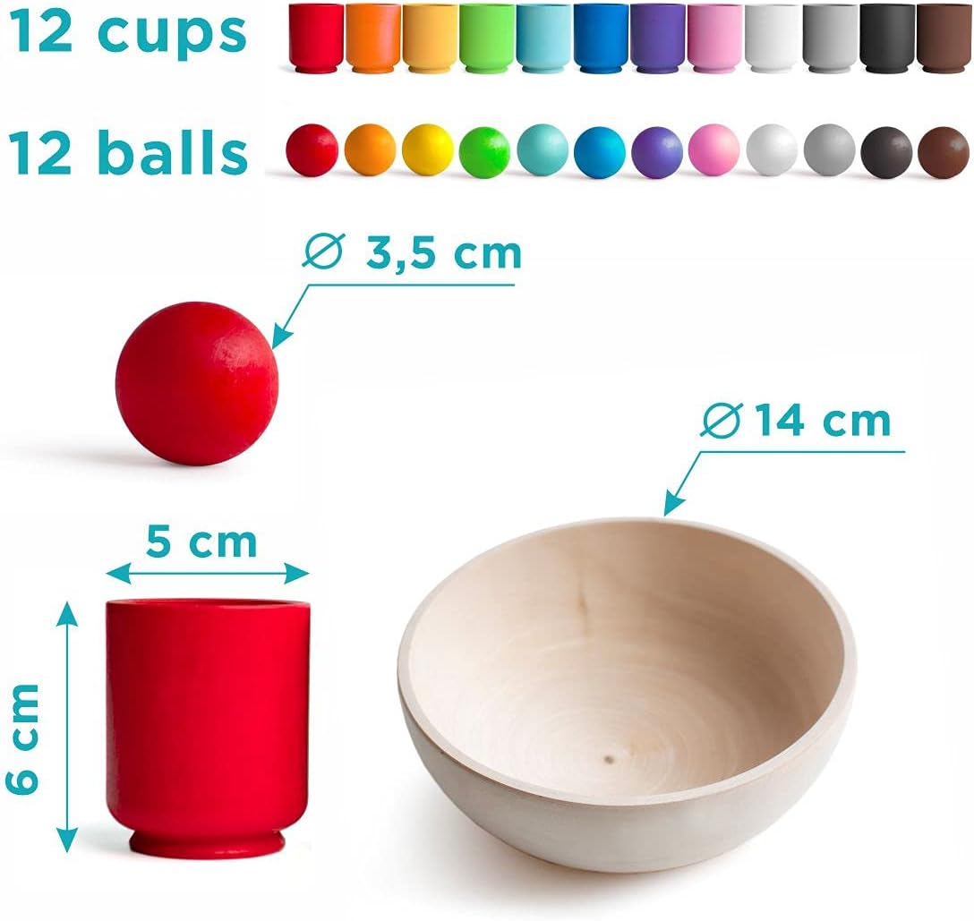 INCLUYE: 12 bolas de madera de colores; 12 vasos clasificadores de madera; un tazón; una cuchara (no diseñada para caber dentro de las tazas); una bolsa de lino para guardar las pelotas; una bandeja de madera para mantener todo en su lugar en tu habitación Montessori; Combina con otros nuestros clasificadores