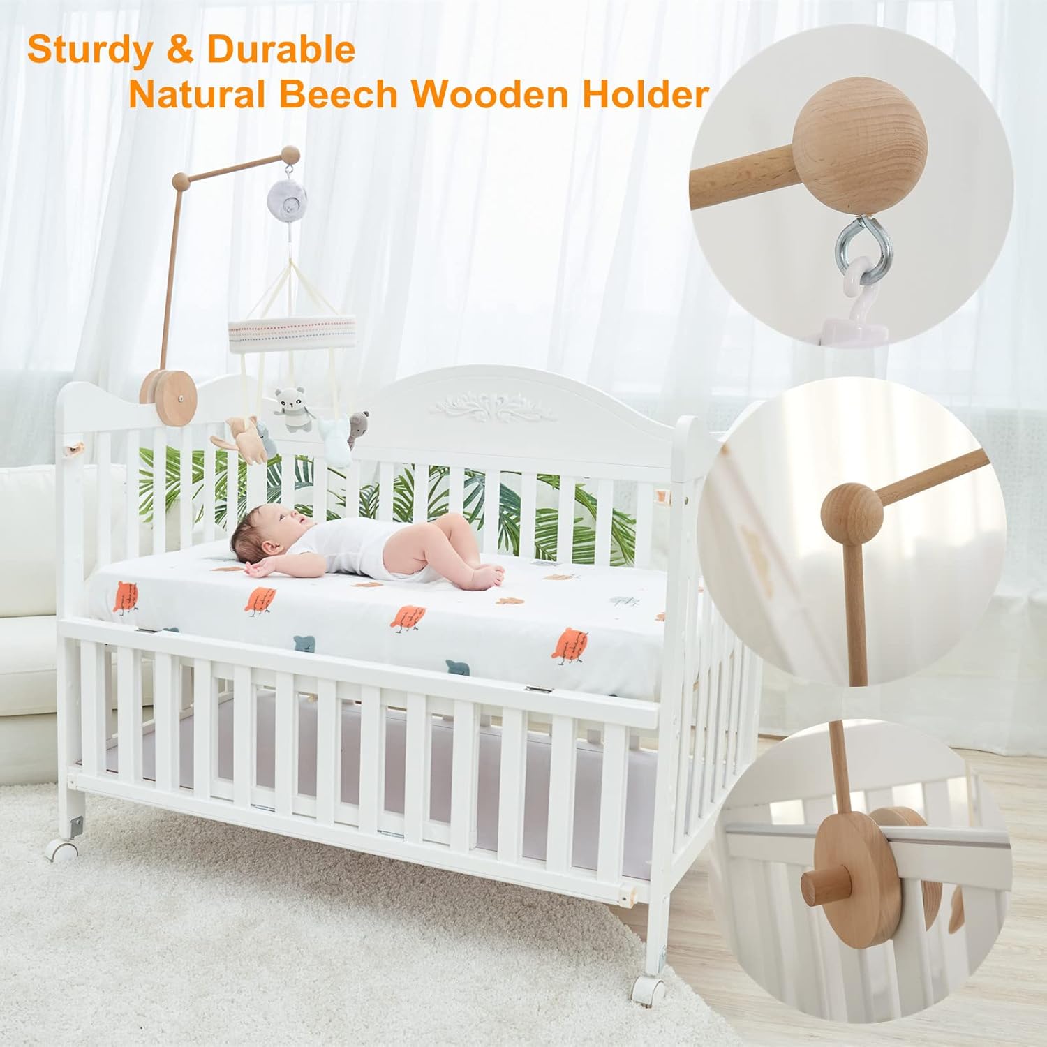 - Móvil para cuna de alta calidad: el soporte móvil para cuna (diámetro: 9.45 x 9.45 pulgadas) está hecho de madera de haya natural segura y confiable, el personal mide 18 pulgadas de altura y 12 pulgadas de extensión, es muy resistente y duradero. Adoptando telas agradables al tacto, estos juguetes de animales son seguros y cómodos para ti y tu bebé.