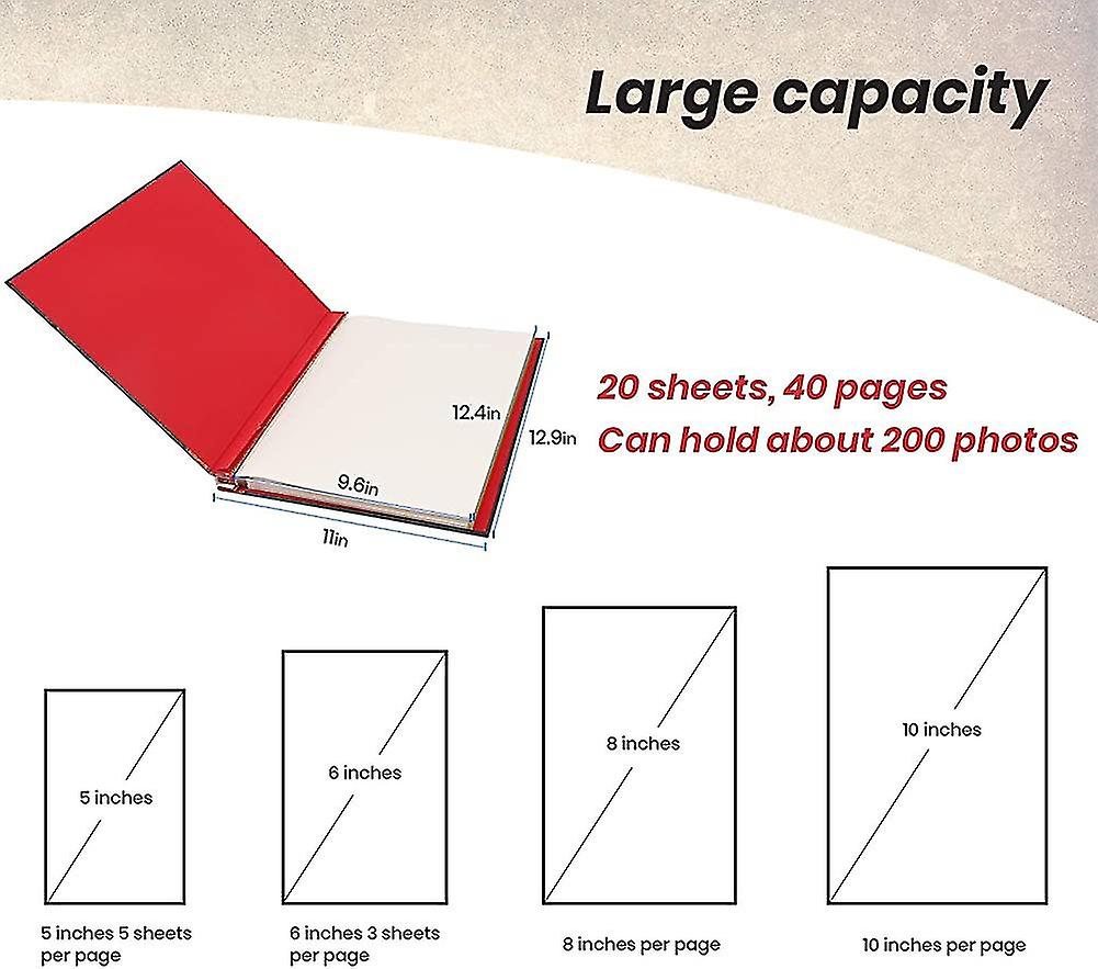Tamaño y capacidad: Este álbum de fotos tiene un tamaño de 11 x 12,9 pulgadas, un tamaño interior de 9,6 x 12,4 pulgadas y 20 hojas / 40 páginas. Guarda fotos, boletos y certificados de muchos tamaños. .