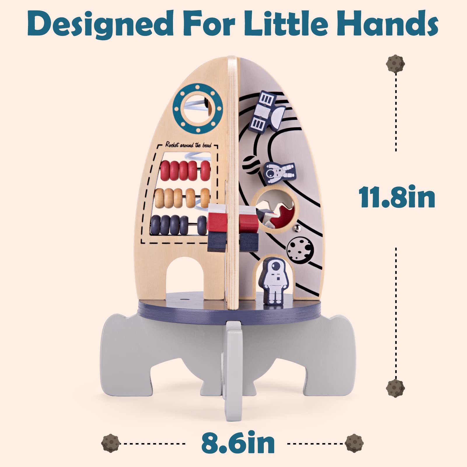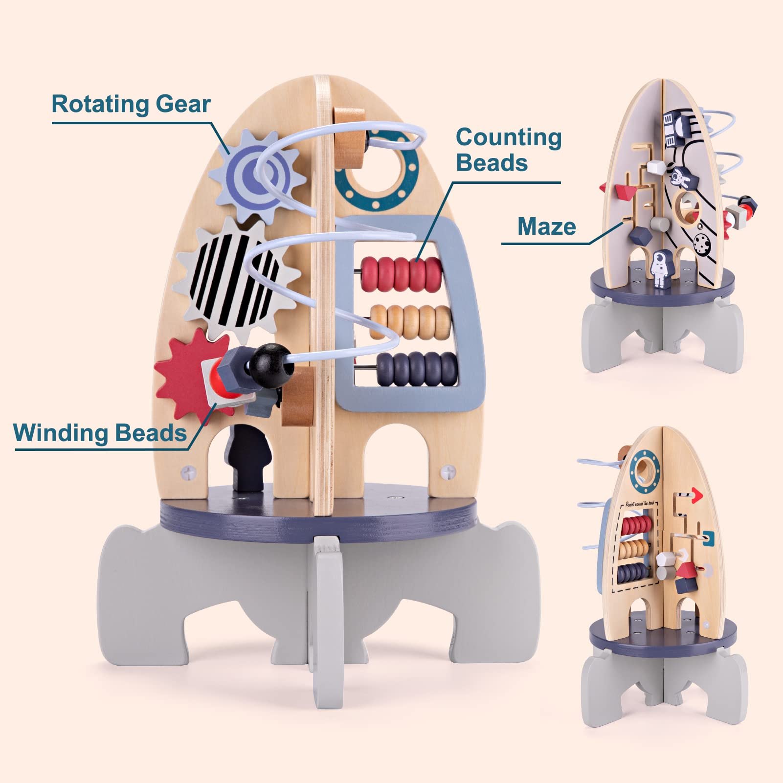 - Cubo de actividad 4 en 1: nuestro cubo de actividades de cohete incluye laberinto de cuentas, combinación de formas, ábaco y equipo giratorio. En comparación con las formas cuadradas normales, la forma única de cohete es más atractiva y lleva los pensamientos de los bebés al espacio misterioso.