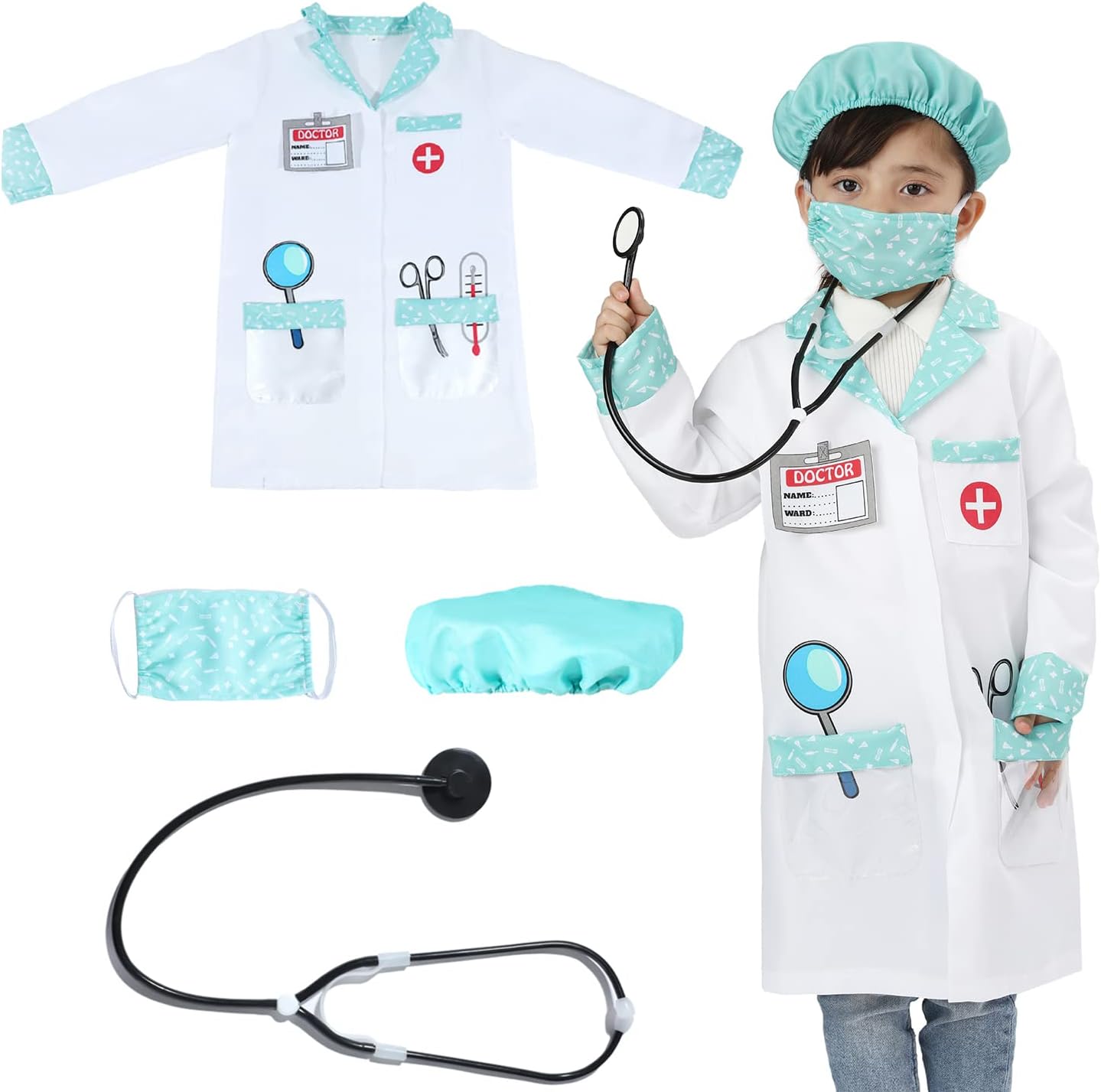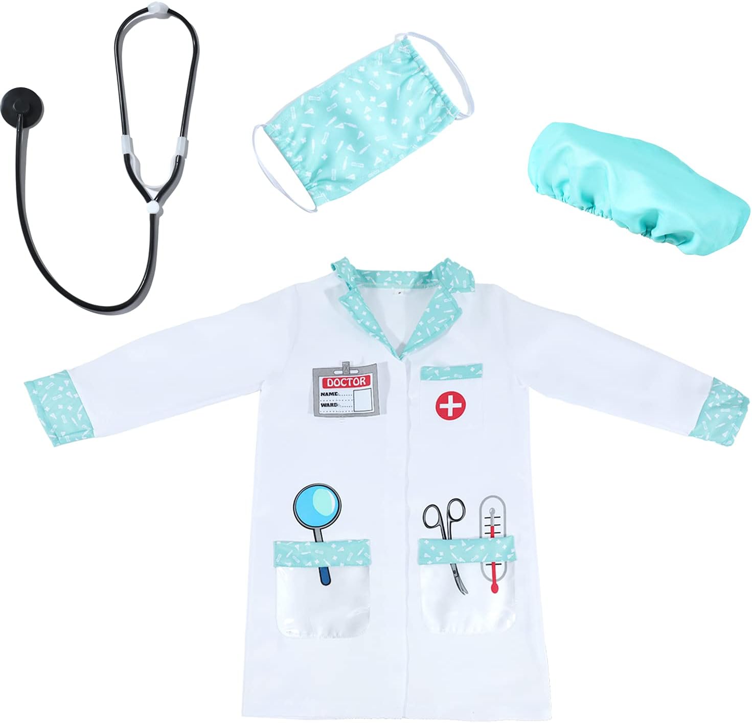 Juego de doctor para niños y niñas] - 5 piezas con bata de doctor (longitud del muslo), máscara facial, sombrero, estetoscopio de alta calidad, placa de identificación.