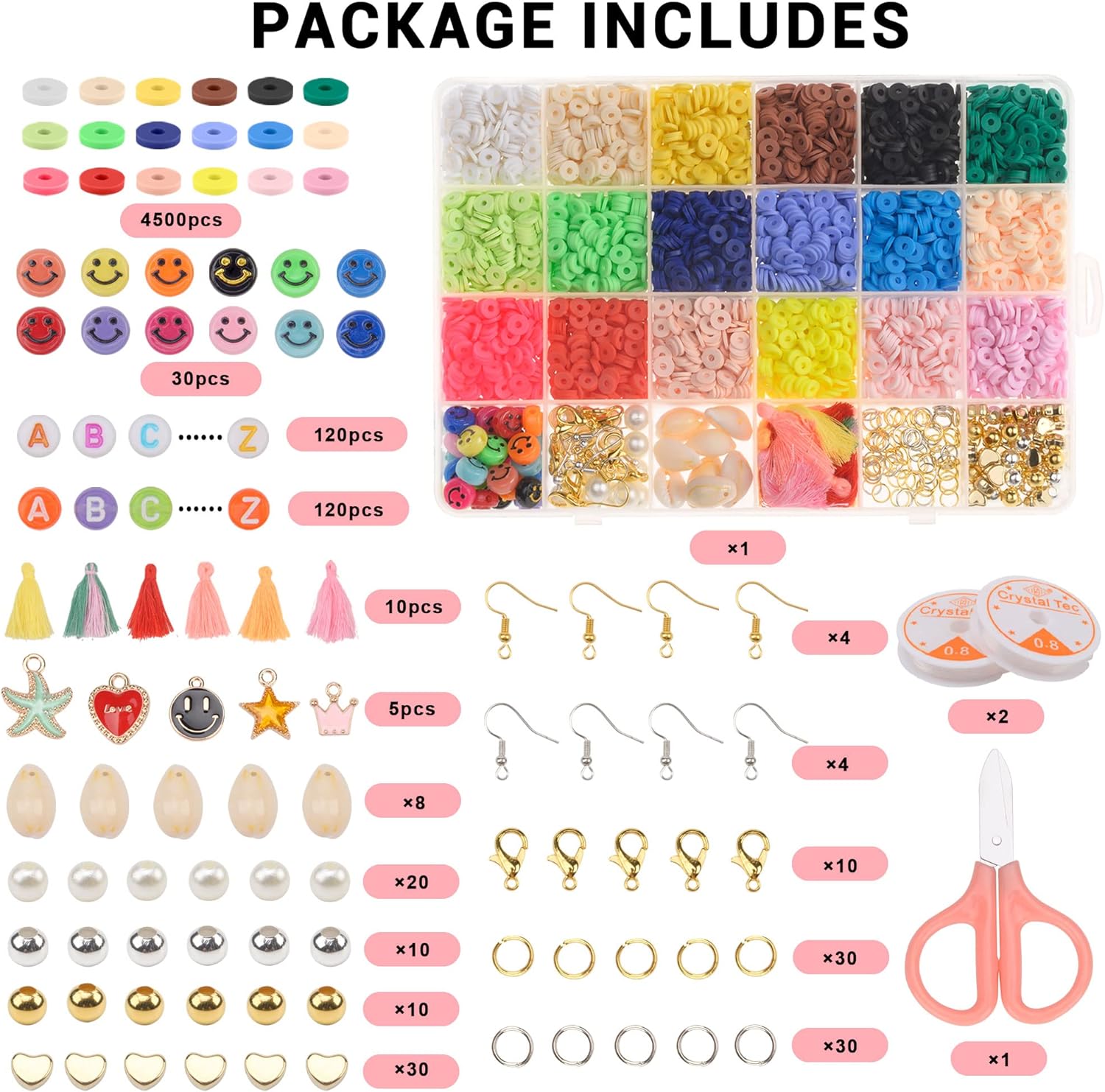 - Kit de gran valor: para los amantes de la fabricación de joyas, un kit de fabricación de pulseras premium con 4500 cuentas de arcilla polimérica redondas planas en 18 colores y 500 dijes como colgantes coloridos llamativos, cuentas de letras, cuentas de corazón, cuentas de perlas, cuentas de bola, cuentas de cara sonriente, ganchos para aretes, cierre de langosta, borlas, conchas, anillos de salto, tijeras y 2 rollos de cuerdas elásticas. Juego de regalo perfecto. Libro electrónico incluido.