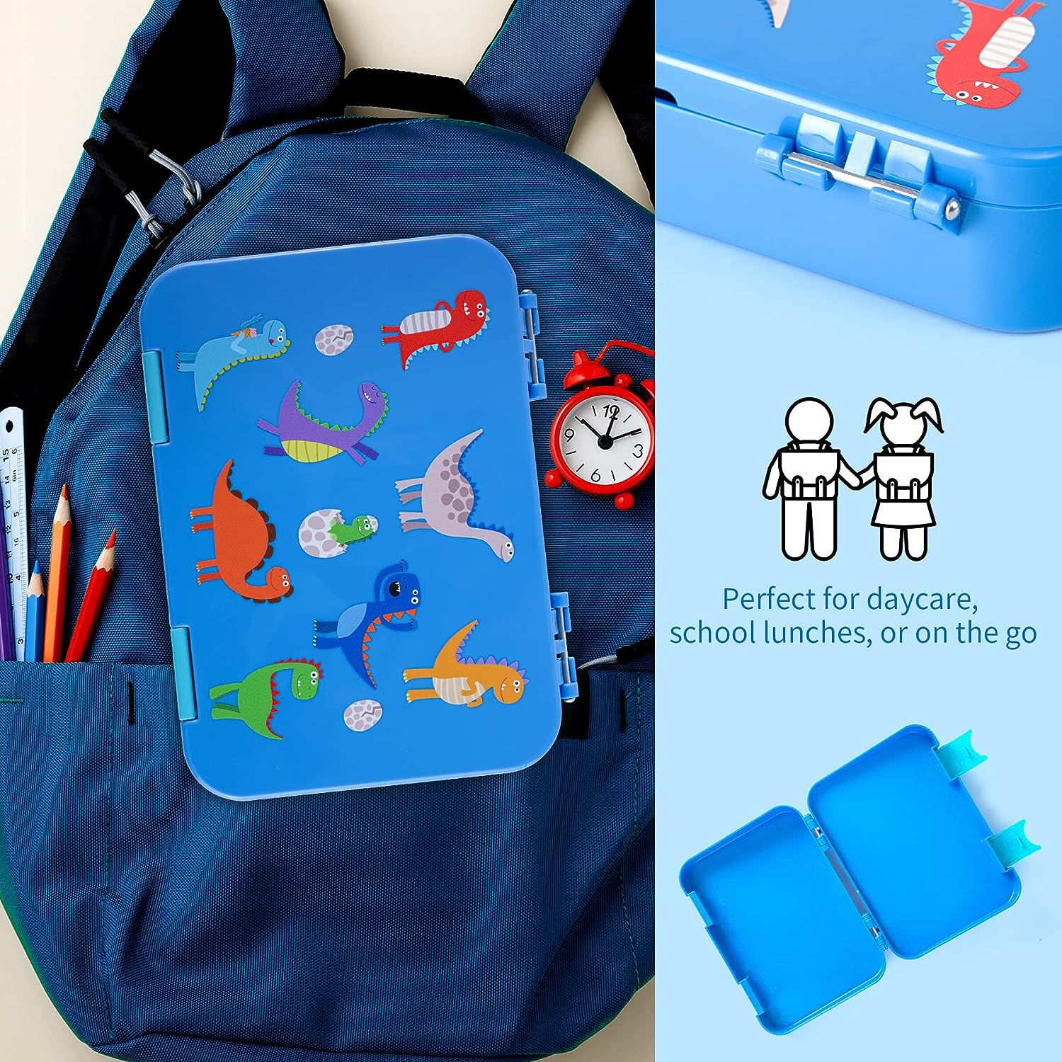 El estilo favorito de los niños: los niños verán los encantadores dinosaurios coloridos en la superficie azul cielo de los recipientes de almuerzo para niños antes de abrirlos y almorzarán con una sonrisa. Las imágenes de los dinosaurios tienen licencia del simpático artista StockSmartStart.